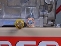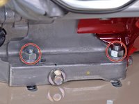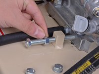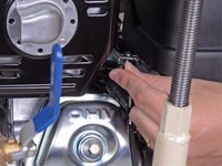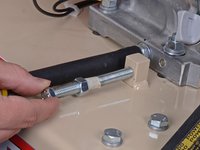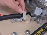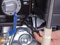 Use a 9/16 inch wrench to loosen the four nuts securing the engine block to the frame, two on the front and two on the back.