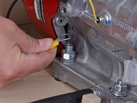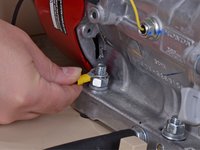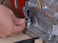 Use a 9/16 inch wrench to remove the nut securing the ground wire to the engine block.