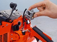 Pull the guide bar away from the device to separate the saw chain from the clutch drum.