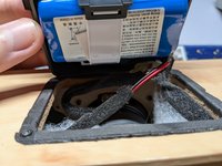 To remove the battery from the cage, unscrew the two screws holding it in place. Since the wires are glued, use a hairdryer to soften the adhesive and gently pull the cable out.