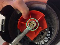 Remove nut with a ½” wrench (or socket) clockwise while holding the fan blade still.