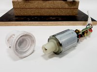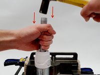 Set up the motor and remaining casing in a vice as shown in the picture. Take the dowel and place it in the opening of the remaining casing, and rest it on the metal whisk driver. GENTLY hammer downwards on the dowel until the motor falls through.