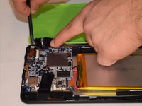 Once you pry off the plastic backing, you will expose the battery and the motherboard.