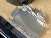 In the second photo you can see where I mangled the bottom corner of the metal cover where I had cut a hole in the base- I just cut off the mangled part before replacing it.