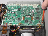Remove the two screws holding down the motherboard using a Phillips #00 screwdriver.