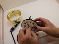 Last, you must remove the clock's entire inner apparatus from its golden cover in order to remove the hands.