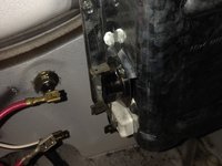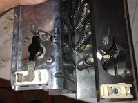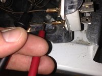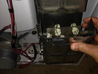 With your 6mm socket remove the bolt holding the high limit thermostat and *gently* pry back the top tab. Again *gently* pull the "L" shaped connector off the element terminal.