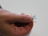 Hold the wires closely together in the order shown in the previous step and push them into the new RJ45 connector, with the clip end of the connector facing down, and the orange/white wire to the left.