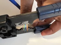 Place the RJ45 into the crimper at the end of the tool. Push it in all the way, it will fit exactly in the tool—you can not push it in too far.