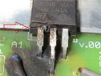 This one broke at the housing, look at the red arrow. The pins are bent directly at the housing, so this destruction occured at the montage of the triac ! bad. :( The current let it explode and damaged it complete.