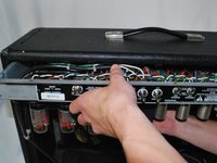 Take off the back panel by unscrewing the four Phillips head screws on the back of the amplifier.