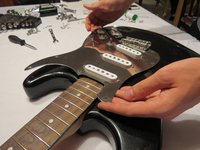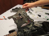 Carefully rotate the pickguard away from the guitar. Notice the electronics. There is a wire that runs through the body to the output jack.