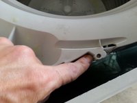 • Simply pry off the plastic screw covers then unscrew the two forward screws. Note there is no need to remove the cover, just tilt it backwards on its hinge to gain access. Be careful with hoses and electrical wires at the back of the cover.