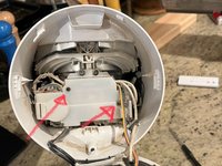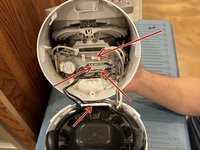 The arrows show the 4 places to disconnect the wires so you can separate the top from the bottom. The white connectors under the sheath may also have a tiny lock tab that you need to push in while pulling them apart. Make sure to take note of how the wires run before take off the cover.