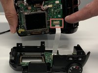 The back cover contains the LED screen that displays your photos after they have been taken, the viewfinder that frames your photos, and a ribbon cable to activate the camera shutter. A shattered glass display, viewfinder, or damaged ribbon cable may result in delayed photos or a poor viewing experience.