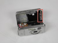 Locate the speaker at the end of the pair of red and black wires holding the halves of the case together. Take care not to pull the wires, else they may detach from the motherboard and damage the camera.
