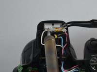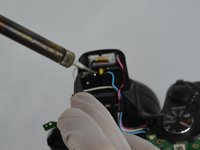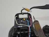 Unsolder the connections shown in the image that connect the black, pink, and blue wires to the bulb.