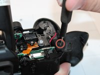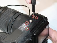 The first screw is below and to the left of the command dial on the back of the camera.