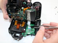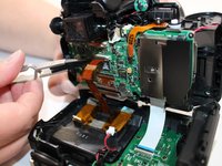 Remove the white LCD FPC from the camera back and the orange LCD FPC from the main body to separate the camera. Start by gently pulling the white LCD FPC away from the back of the camera, then remove the orange LCD FPC from the main body of the camera.