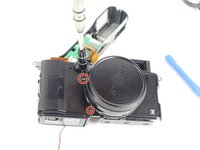 Once the lens has been taken off, flip the camera over and unscrew the two 4.0 mm screws on the front of the camera, next to the lens cover.