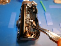 Using a pair of pliers, pull the rod out of the top plate of the camera. Now you'll have access to the port flap spring.