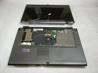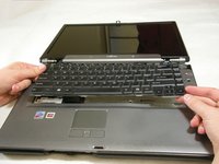 Hold down the body of the computer by placing your hands in the pictured positions. Then, lift the display from the body.