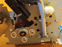 Remove the block of three cogwheels to allow access to the black drive pulley.