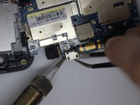 Using the tweezers and soldering iron, desolder the charging port at all 4 soldering points on each corner of the charging port.
