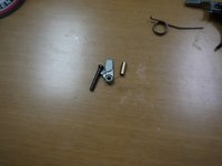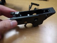 • Insert the pin and brass spacer halfway in, then place the auto sear in as shown in the second picture. Push the pin all the way in. The spring leg that sticks out should point towards the FRONT of the gun.