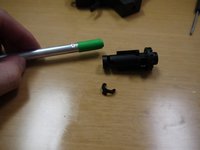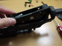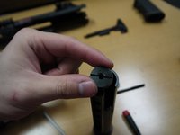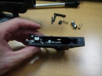 • Remove the screw from the magazine catch. After the screw is removed, the magazine catch assembly should come apart in four pieces (screw, button, spring, arm).