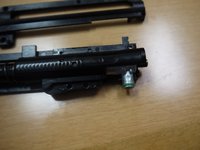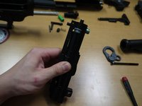 • Punch out the small receiver pin from the right side of the gun (see picture). It is important that you do not try to do this from the right side. One end of the pin is textured to prevent it from coming loose, and pushing this end through the receiver may cause minor damage.