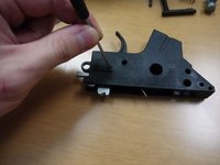 • Insert the disconnector spring in round slot on the trigger. Put the disconnector back in the trigger and insert the brass trigger pin through the trigger and the disconnector.