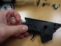 • Push out the auto sear pin. The auto sear assembly should proceed to come out in three parts: sear, spring, and brass spacer.