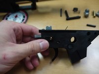 • Pull the brass trigger pin out from the left side; the disconnector and spring will proceed to fall out.
