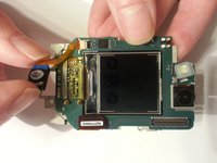 Lift the board out of the case starting with the top. Continue to fold it forwards to access the ribbon cable still connecting it.