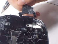 Finally remove the screws holding in the right and left triggers. It's easiest to hold the trigger together as shown in the third picture. Remove both the left and right trigger, and then you have successfully removed your back panel.