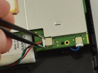 Using the tweezers, pull the white plastic connector to disconnect the battery from the motherboard.