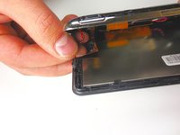 Leverage the plastic opening tool to pop the tabs between the black screen and the metal frame around the perimeter of the device.
