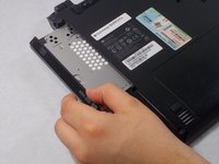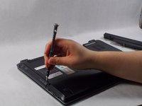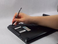 Turn the laptop over so the bottom of the device is facing upwards with the hinge facing away from you.