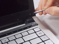 Use the Small metal spudger to remove the small black screw covers in the bottom corners of the screen