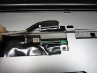 Using your fingers, carefully pry upwards on the two gold prongs holding in the connection cable, to free it. These are located at the top left side of the case near the display hinge.