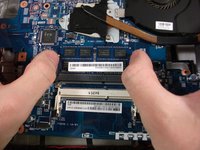 Using your two thumbs to pull outwards from the inside of the RAM slot to release and remove the RAM.