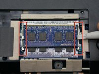 Free the RAM by unlatching the holders. The two arms on either side of the RAM card should be pried away from one another.