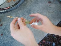 Clear air out of the syringe by holding it upright, flicking on it with your finger, and pushing on the stopper until hydraulic fluid starts to come out.