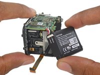 After savaging most of the exterior, we aren't surprised to find the GoPro's battery soldered to the motherboard and glued into a bracket.