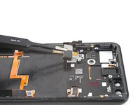 Use the flat end of a spudger to carefully pry up the black tape holding the display flex cable in place, near the right edge of the phone.