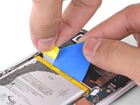 As you pull on the adhesive tab, maintain pressure on the opening pick to wedge it underneath the battery as much as possible.