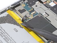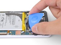 Insert the flat end of an opening pick into the gap above the battery, behind a yellow pull tab.