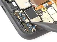 Use a pair of tweezers to peel away the side button flex cable from the button bracket, on the inside edge of the phone's frame.