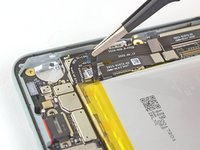 Use blunt nose tweezers to grip the black adhesive pull tab located on the top right edge of the battery. Lift the pull tab with the tweezers until you are able to grip it with your fingers.